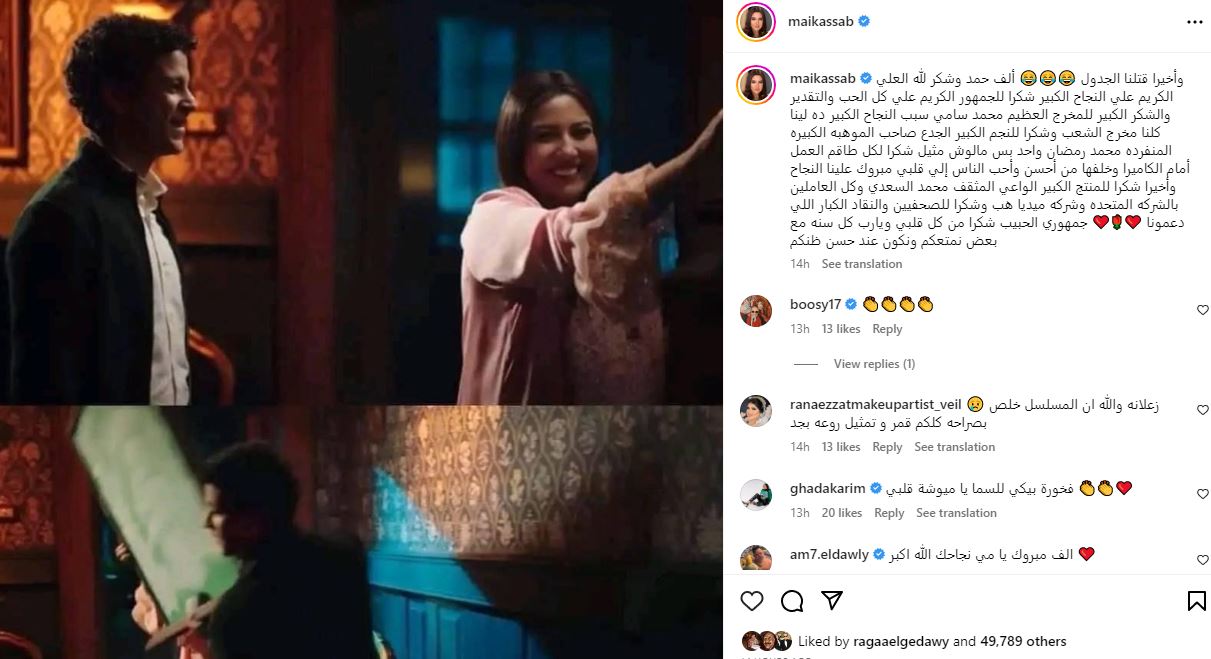 وكتبت مي كساب، قائلة :"ألف حمد وشكر لله العلي الكريم علي النجاح الكبير شكرًا للجمهور الكريم علي كل الحب والتقدير والشكر الكبير للمخرج العظيم محمد سامي سبب النجاح الكبير ده لينا كلنا مخرج الشعب وشكرًا للنجم الكبير الجدع صاحب الموهبة الكبيرة المنفردة محمد رمضان واحد بس مالوش مثيل شكرًا لكل طاقم العمل أمام الكاميرا وخلفها من أحسن وأحب الناس إلي قلبي".