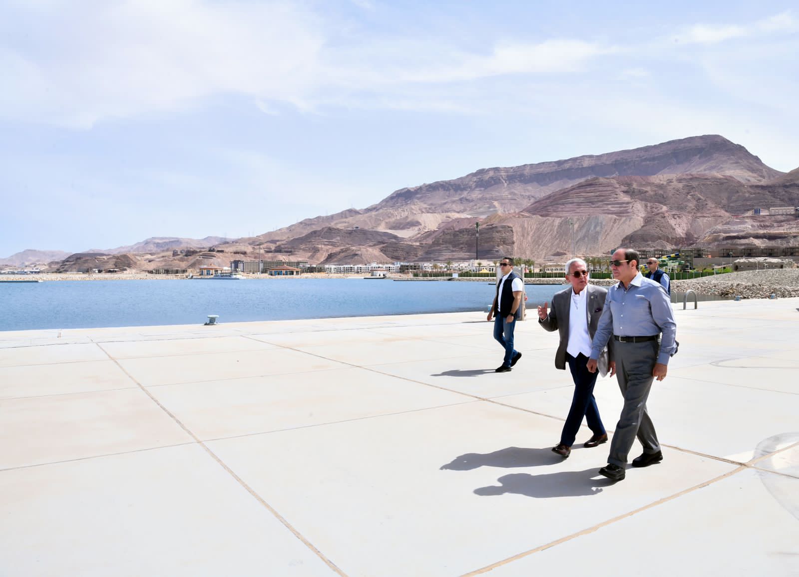 كما تفقد الرئيس السيسي مناطق المنتجعات والكورنيش والنصب التذكاري لمدينة الجلالة حيث التقي بالقائمين علي المشروع وهنأهم بعيد الفطر المبارك، كما اطمأن منهم علي سير العمل بالمشروع .