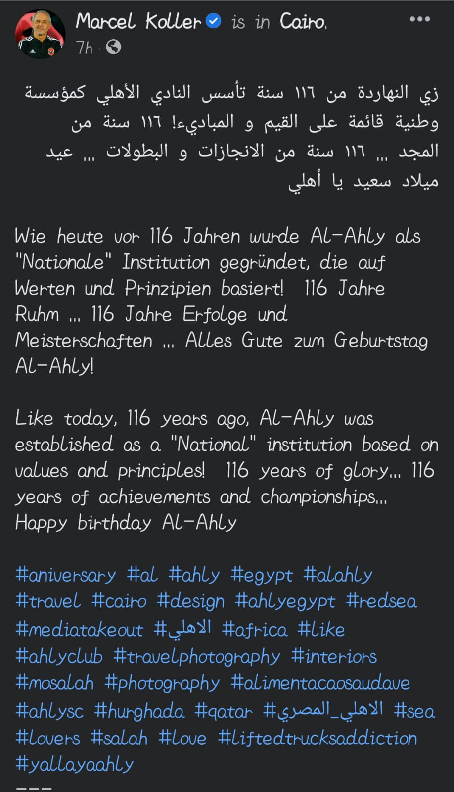 وكتب مارسيل كولر عبر صفحته على موقع التواصل الاجتماعي "فيسبوك": "زي النهارده من 116 سنة تأسس النادي الأهلي كمؤسسة وطنية قائمة على القيم و المبادئ! 116 سنة من المجد ... 116 سنة من الإنجازات و البطولات ... عيد ميلاد سعيد يا أهلي".