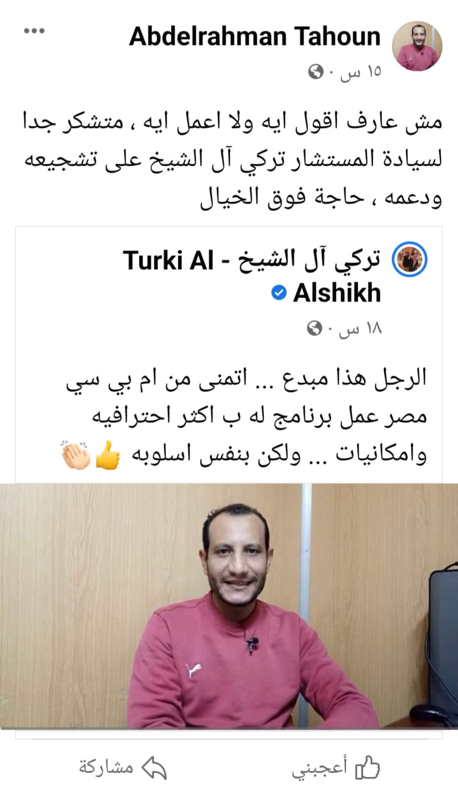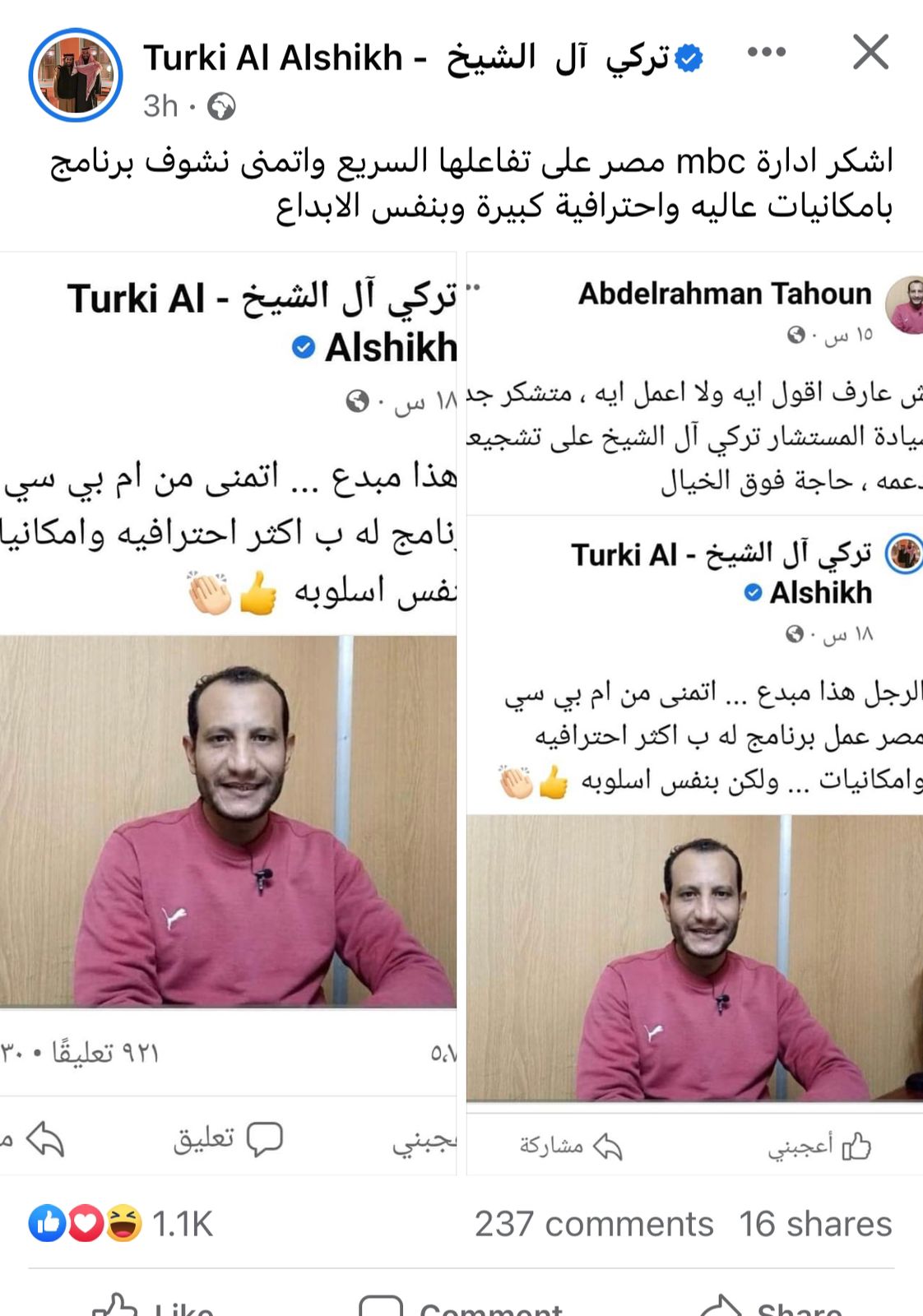 وطالب المستشار تركى الشيخ القائمون على قناة MBC مصر إنتاج له برنامج وكتب على صفحته بموقع فيس بوك:"الرجل هذا مبدع، اتمنى من ام بي سي مصر عمل برنامج له ب اكثر احترافيه وامكانيات، ولكن بنفس اسلوبه"، وبالفعل استجابت القناة لطلب آل الشيخ وتعاقدت مع عبد الرحمن طاحون لتقديم برنامج عبر شاشتها، ليقوم آل الشيخ بتوجيه الشكر لإدارة القناة خلال منشور جديد على فيس بوك كتب فيه :" اشكر ادارة mbc مصر على تفاعلها السريع واتمنى نشوف برنامج بامكانيات عالية واحترافية كبيرة وبنفس الابداع".
