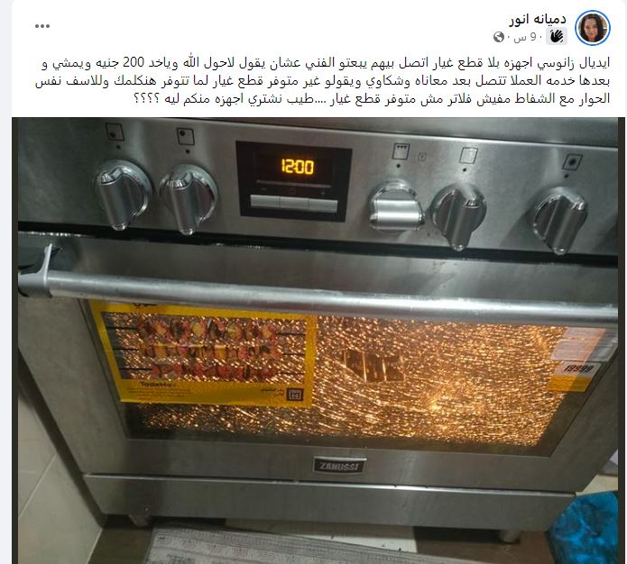 وقالت صاحبة المشكلة،" ايديال زانوسي اجهزه بلا قطع غيار اتصل بيهم يبعتو الفني عشان يقول لاحول الله وياخد 200 جنيه ويمشي و بعدها خدمه العملا تتصل بعد معاناه وشكاوي ويقولو غير متوفر قطع غيار لما تتوفر هنكلمك وللاسف نفس الحوار مع الشفاط مفيش فلاتر مش متوفر قطع غيار ....طيب نشتري اجهزه منكم ليه ؟؟؟؟".