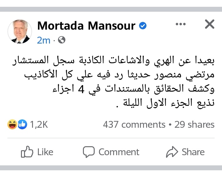وكتب مرتضى منصور عبر حسابه على موقع التواصل الاجتماعي فيس بوك قائلا: "بعيدا عن الهري والإشاعات الكاذبة سجل المستشار مرتضي منصور حديثا رد فيه علي كل الأكاذيب وكشف الحقائق بالمستندات في 4 اجزاء نذيع الجزء الاول الليلة".