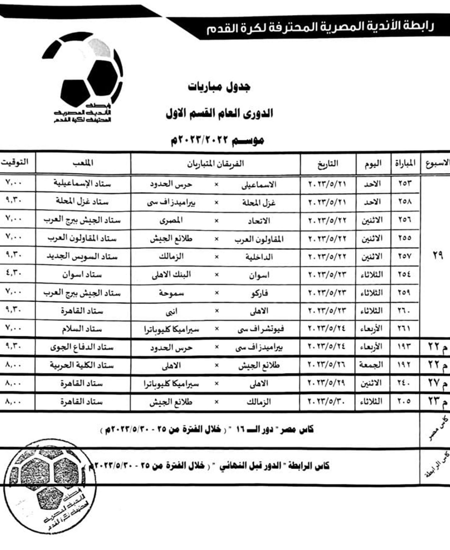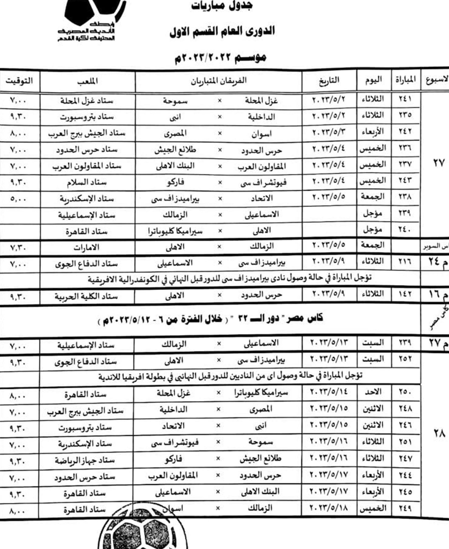 أعلنت رابطة الأندية المصرية المحترفة برئاسة أحمد دياب، بالتنسيق مع عامر حسين المشرف على إدارة المسابقات باتحاد الكرة، عن مباريات الجولات الـ27 و28 و29 من الدوري المصري بالإضافة لمواعيد دور الـ32 و16 من كأس مصر ونصف نهائي كأس الرابطة.