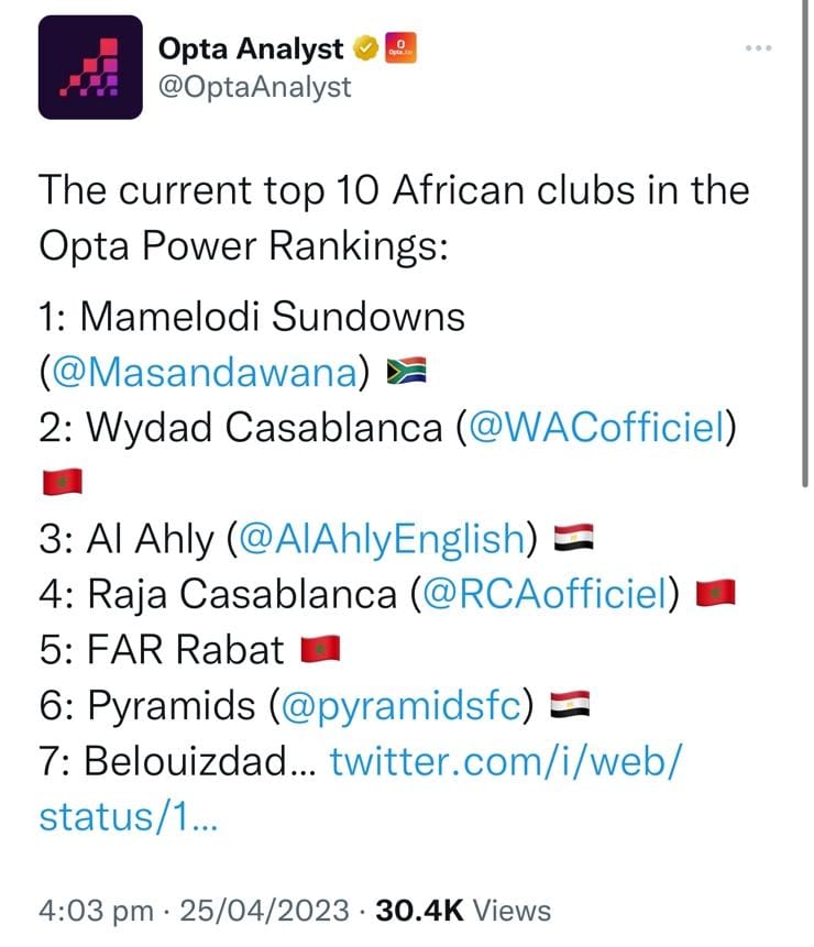 وطبقا لأوبتا وبعد تحليل إحصائيات ونتائج جميع الأندية الأفريقية خلال السنوات الماضية جاء بيراميدز سادسا في الترتيب، وجاء في المركز الأول، صن داونز الجنوب أفريقي ثم الوداد المغربي والأهلي المصري والرجاء المغربي والجيش الملكي المغربي خامسا ثم بيراميدز سادسا وشباب بلوزداد الجزائري في الترتيب السابع.