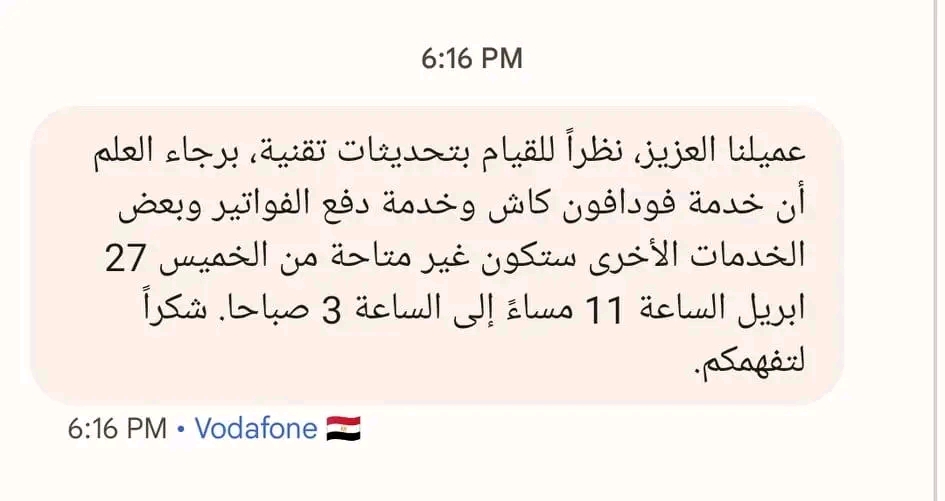 وأفادت شركة فودافون مصر في رسالة لعملائها أن هذا التحديث يأتي ضمن سعيها المستمر لتطوير خدماتها وتحسينها لتلبية احتياجات عملائها بشكل أفضل، وأنها تعمل على إعادة الخدمات إلى طبيعتها في أقرب وقت ممكن.