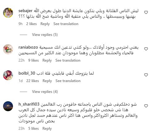 وجاء تعليق آخر قائلة:" لما يتجوزك ابقي قابليني قلت أدب"، وبسبب هذة التعليقات قررت نادين نجيم بإغلاق التعليقات .