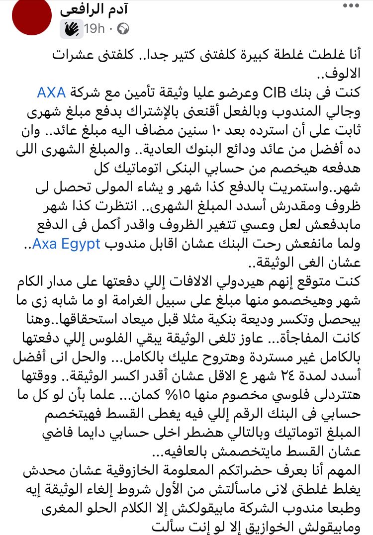 واستعرض المواطن تجربته السيئة مع بنك CIB ، قائلا" أنا غلطت غلطة كبيرة كلفتنى كتير جدا.. كلفتنى عشرات الالوف.. كنت فى بنك CIB وعرضو عليا وثيقة تأمين مع شركة AXA وجالي المندوب وبالفعل أقنعنى بالإشتراك بدفع مبلغ شهرى ثابت على أن استرده بعد 10 سنين مضاف اليه مبلغ عائد.. وان ده أفضل من عائد ودائع البنوك العادية.. والمبلغ الشهرى اللى هدفعه هيخصم من حسابي البنكى اتوماتيك كل شهر..واستمريت بالدفع كذا شهر و يشاء المولى تحصل لى ظروف ومقدرش أسدد المبلغ الشهرى.. انتظرت كذا شهر مابدفعش لعل وعسي تتغير الظروف واقدر أكمل فى الدفع ولما مانفعش رحت البنك عشان اقابل مندوب Axa Egypt.. عشان الغى الوثيقة".