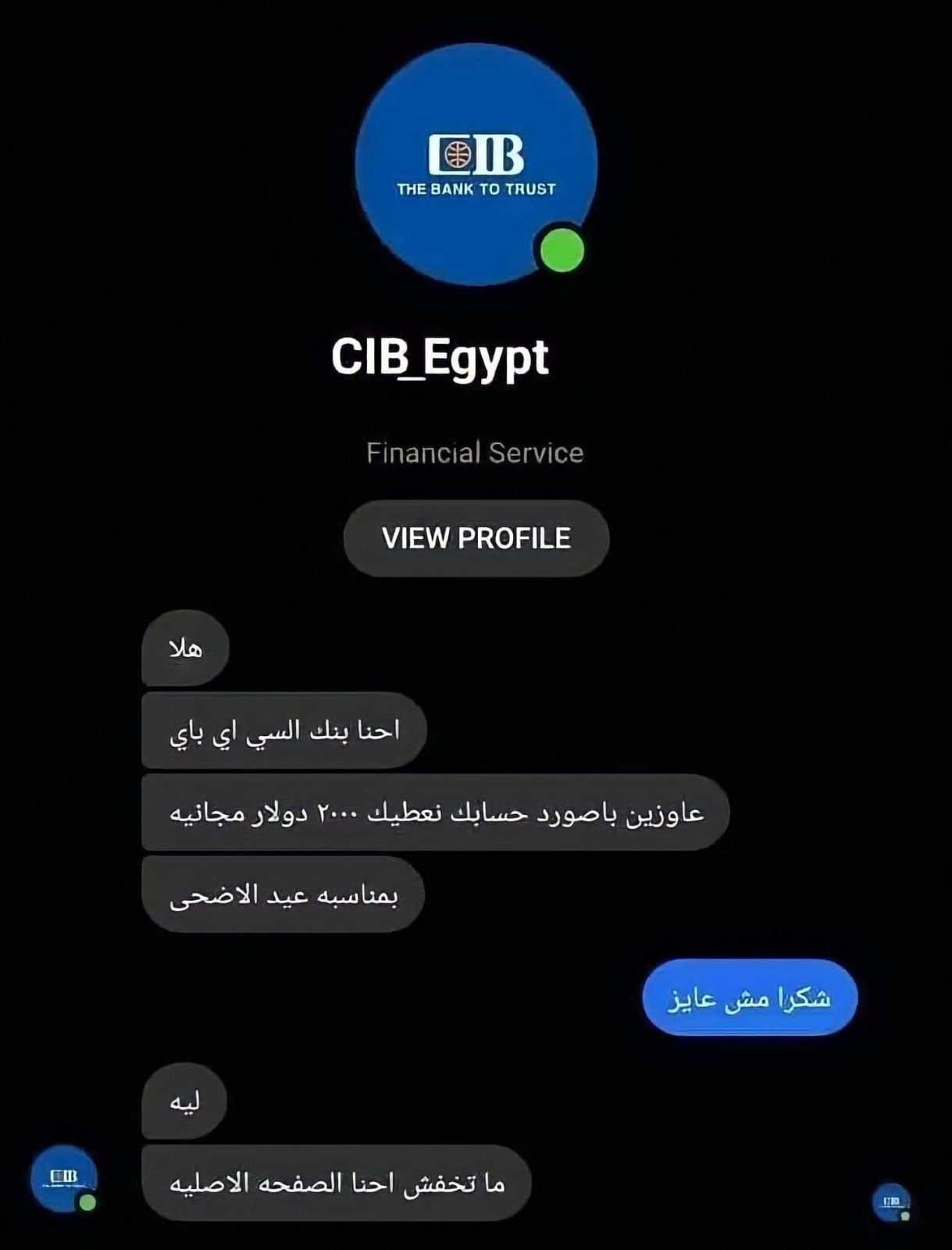 تداول رواد مواقع التواصل الاجتماعي رسالة تحذيرية من هاكرز ينتحل صفة مسئولي صفحة بنك CIB، ومطالبته للعملاء برقم الحساب، وفى تفاعل مع رسالة الهاكرز سخر المواطنين وتفاعلوا مع رسالة الهاكرز بطريقة طريفة وساخرة ، محذرين فى الوقت ذاته من مثل هذه الرسائل التى تهدف لسرقة عملاء البنك ومؤكدين أن هذه الصفحة من الممكن أن تكون صفحة غير حقيقية للبنك وأنها حالة من النصب من بعض الأشخاص ولابد من الحذر.