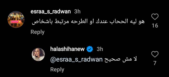 وعلقت متابعة لـ حلا شيحة عبر حسابها الرسمي بموقع تبادل الصور والفيديوهات “انستجرام”، على توجيه لها السؤال بشكل مباشر، حيث قالت: “: هو ليه الحجاب عندك أو الطرحة مرتبط بأشخاص”، لترد عليها حلا شيحة، قائلة: “لا مش صحيح”.