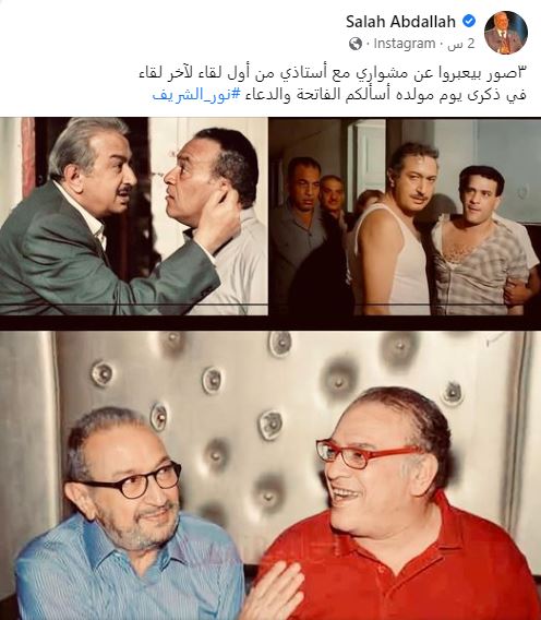 ونشر صلاة عبدالله، صور تجمعه بالراحل نور الشريف، وعلق عليها قائلًا :"3 صور بيعبروا عن مشواري مع أستاذي من أول لقاء لآخر لقاء في ذكرى يوم مولده أسألكم الفاتحة والدعاء، نور الشريف".