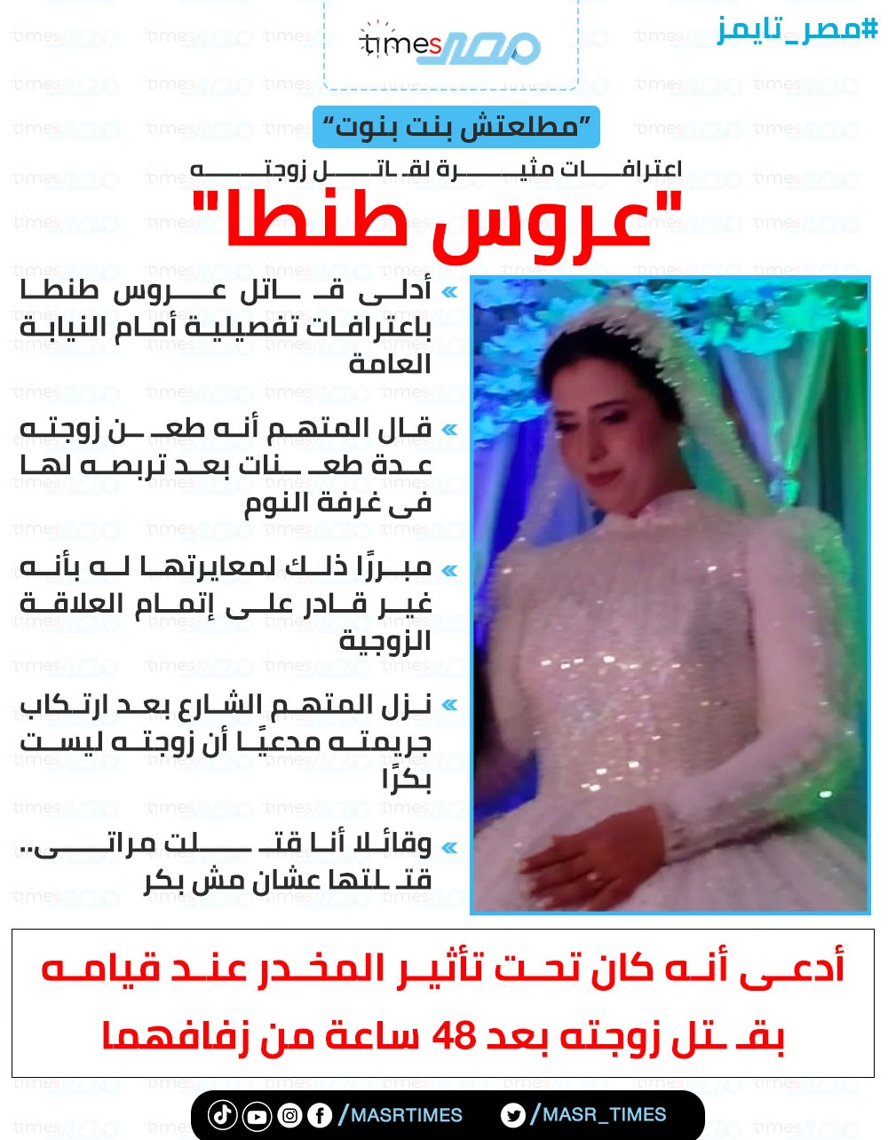 حيث أدلى قاتل عروس طنطا باعترافات تفصيلية أمام النيابة العامة قائلًا، أنه طعن زوجته عدة طعنات بعد أن تربص لها فى غرفة النوم وعاجلها بعدة طعنات فى الصدر والبطن لمعايرتها له بأنه غير قادر على إتمام العلاقة الزوجية.