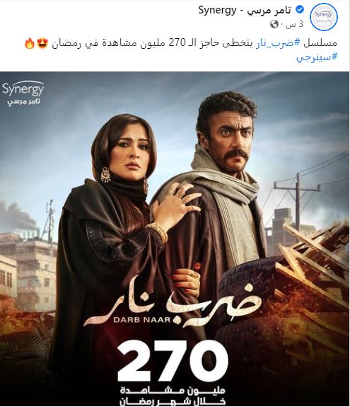وكتب تامر مرسي، قائلًا :"مسلسل ضرب نار يتخطى حاجز الـ 270 مليون مشاهدة في رمضان".