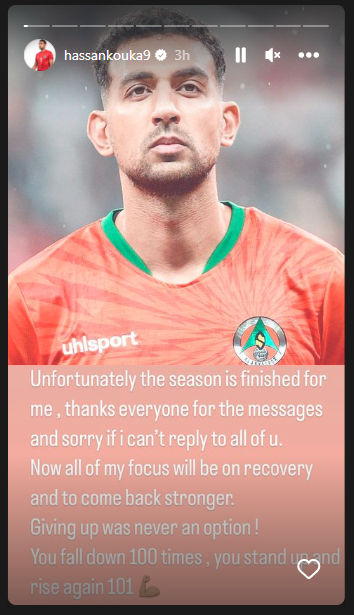 أحمد حسن كوكا لاعب ألانيا سبور كتب عبر "انستجرام": "للأسف الموسم انتهى بالنسبة لي، أشكر الجميع على رسائلهم وأعتذر إذا لم اتمكن من الرد على هذه الرسائل..الآن كل تركيزي سيكون حول التأهيل والعودة بشكل أقوى..من الممكن أن تسقط 100 مرة، ولكن تعود وتقف مرة أخرى"