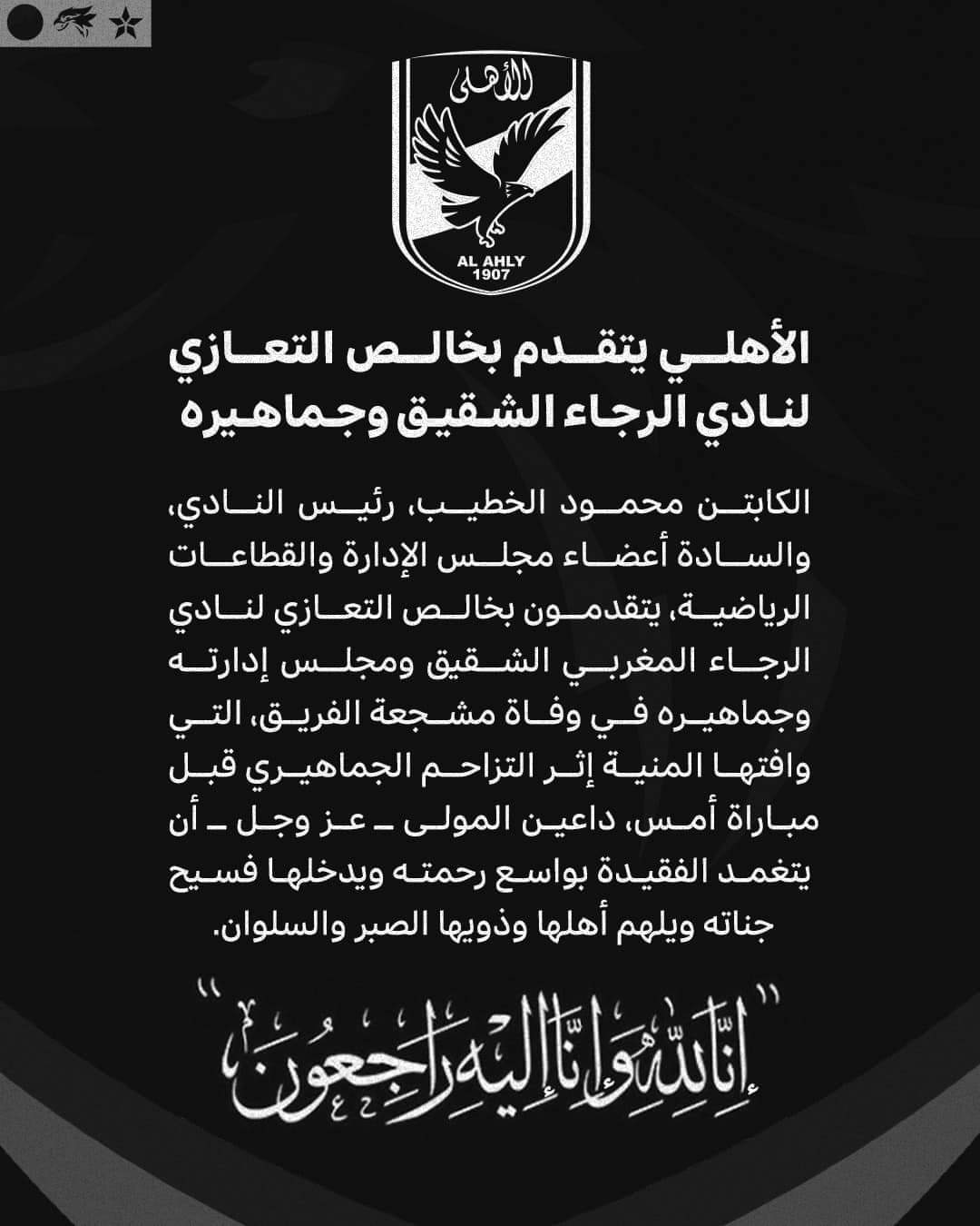 ونشر النادي الأهلي بياناً جاء كالاتي: "الكابتن محمود الخطيب رئيس النادي والسادة أعضاء مجلس الإدارة والقطاعات الرياضية، يتقدمون بخالص التعازي لنادي الرجاء المغربي الشقيق ومجلس إدارته وجماهيره في وفاة مشجعة الفريق، التي وافتها المنية إثر التزاحم الجماهيري قبل مباراة أمس، داعين المولى ـ عز وجل ـ أن يتغمد الفقيدة بواسع رحمته ويدخلها فسيح جناته ويلهم أهلها وذويها الصبر والسلوان".