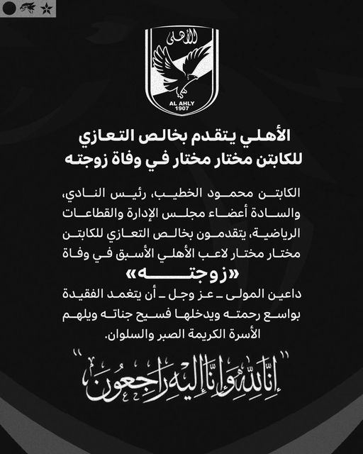 تقدم مجلس ادارة النادي الأهلى برئاسة الكابتن محمود الخطيب التعازي في وفاة زوجته الكابتن مختار مختار نجم الأهلى السابق.