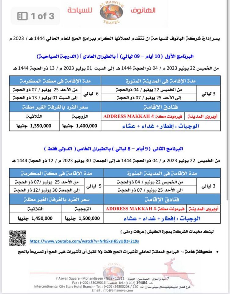 تداول رواد مواقع التواصل الاجتماعي صورة ضوئية لأسعار شركة "الهانوف للسياحة" المملوكة لرجل الأعمال أشرف شيحة، تعلن من خلالها أسعارها لبرنامج الحج، للعام الحالي 144ه / 2023م، حيث عبر العديد منهم عن صدمتهم من الأسعار المتداولة بالصورة الضوئية والذي اعتبره البعض "من أستطاع إليه سبيلاً".