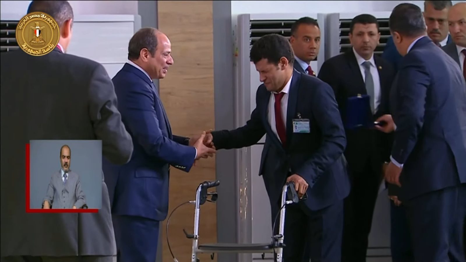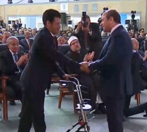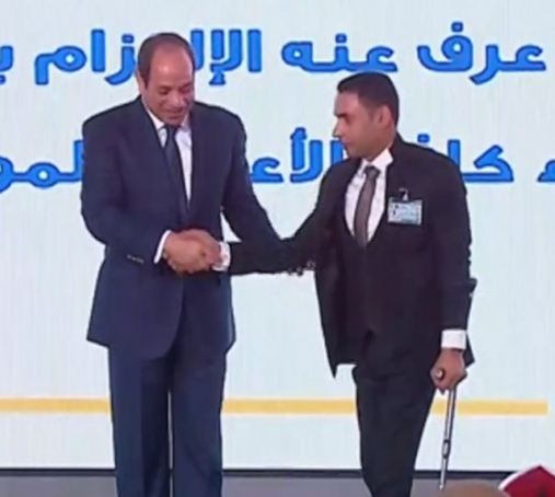 أكمل الرئيس: ارفع نسبة المكون المحلى ومستعد ندخل معاك وبهنيك على المصنع وأتمنى لك التوفيق وأشكركم على التبرع ومزيد من العمل وخلي بالك من صحتهم والرياضة بتاعتهم".