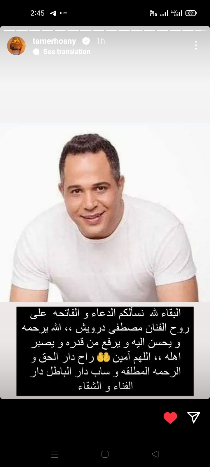 ونشر تامر حسني صورة الفنان الراحل مصطفى درويش عبر خاصية القصص بصفحته الرسمية بموقع إنستجرام قائلًا: "البقاء لله نسألكم الدعاء والفاتحة على روح الفنان مصطفي درويش، الله يرحمه ويحسن إليه ويرفع من قدره ويصبر أهله اللهم آمين، راح دار الحق والرحمة المطلقة وساب دار الباطل دار الفناء والشقاء".