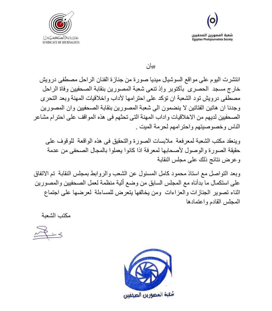 شعبة المصورين الصحفيين تحقق في الصورة المتداولة من جنازة مصطفى درويش