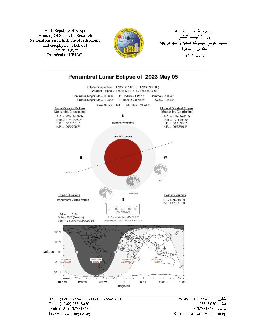 قال الدكتور جاد القاضي، رئيس المعهد القومي للبحوث الفلكية والجيوفيزيقية، بأنه طبقا للحسابات الفلكية التى يقوم بها معمل أبحاث الشمس بالمعهد فإنه سوف يحدث خسوف شبه ظل للقمر يوم الجمعة المقبل، وهو ما يتفق توقيته مع توقيت بدر شهر شـوال لعام 1444هـ.