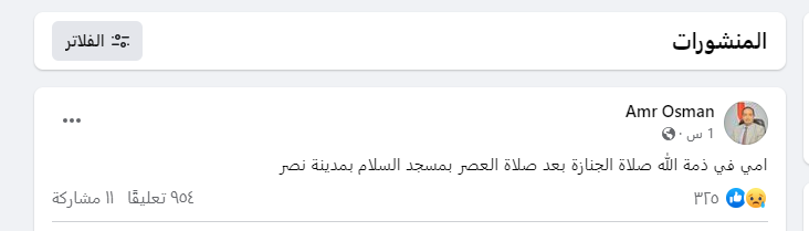 أعلن عمرو عثمان مساعد وزير التضامن الاجتماعي ومدير صندوق مكافحة الإدمان، عن وفاة والدته، صباح اليوم، عبر صفحته الرسمية على موقع التواصل الاجتماعي "فيس بوك".