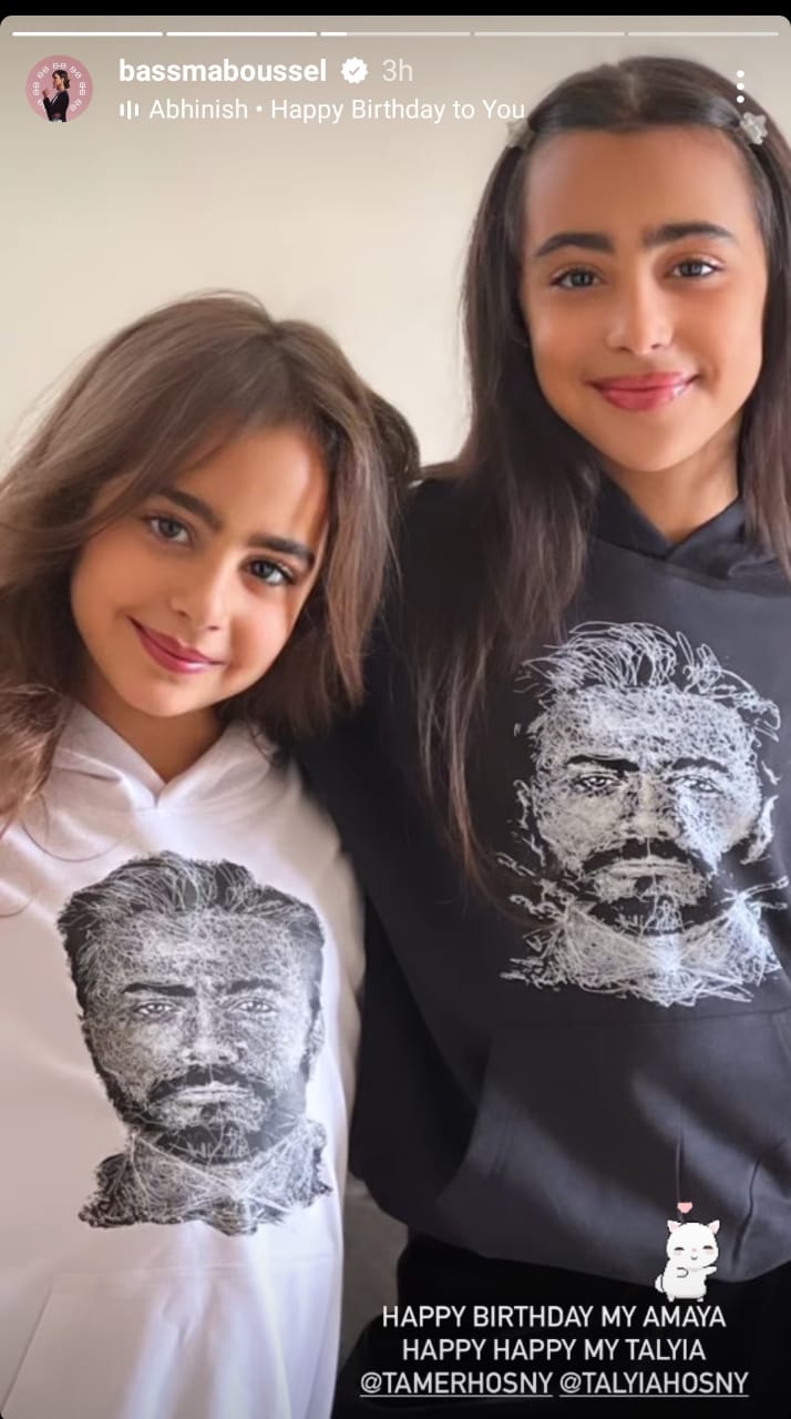 وظهر كل من بنات الفنان تامر حسني، وهما ترتديان تيشيرتات عليها صورة تامر حسني، وعلقت بسمة بوسيل كاتبة: “عيد ميلاد سعيد امايا، عيد ميلاد سعيد تاليا”.