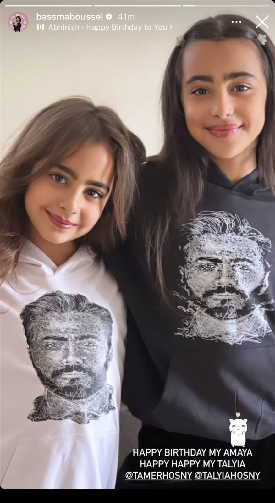 وظهر في الصور بنات الفنان تامر حسني، وهما ترتديان تيشيرتات عليها صورة تامر حسني، وعلقت بسمة بوسيل كاتبة: “عيد ميلاد سعيد امايا، عيد ميلاد سعيد تاليا”، وهو ماجعل الجميع يتحدث عن علاقة الثنائي بعد الانفصال، خاصة أن علاقتهما ببعض جيدة .