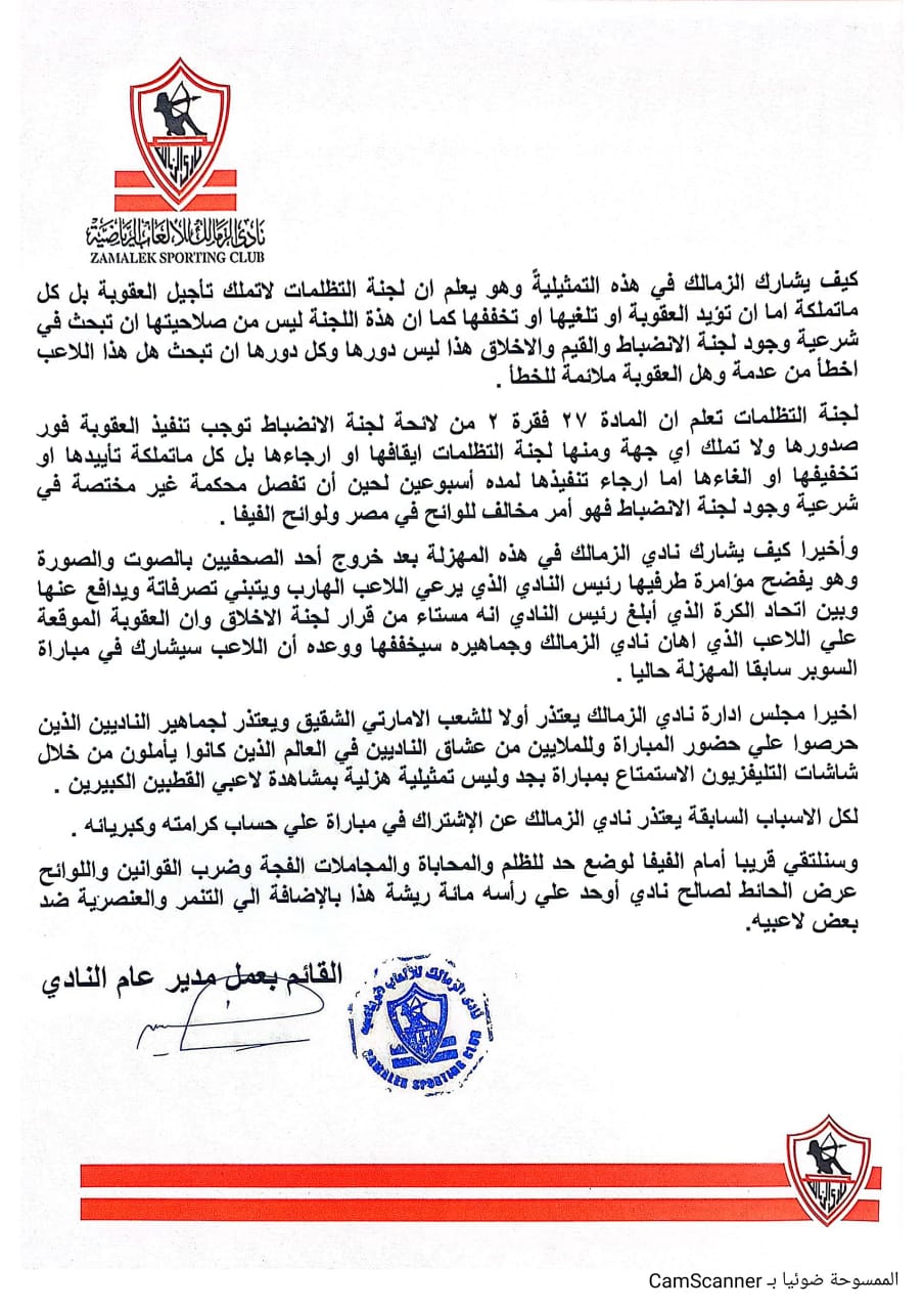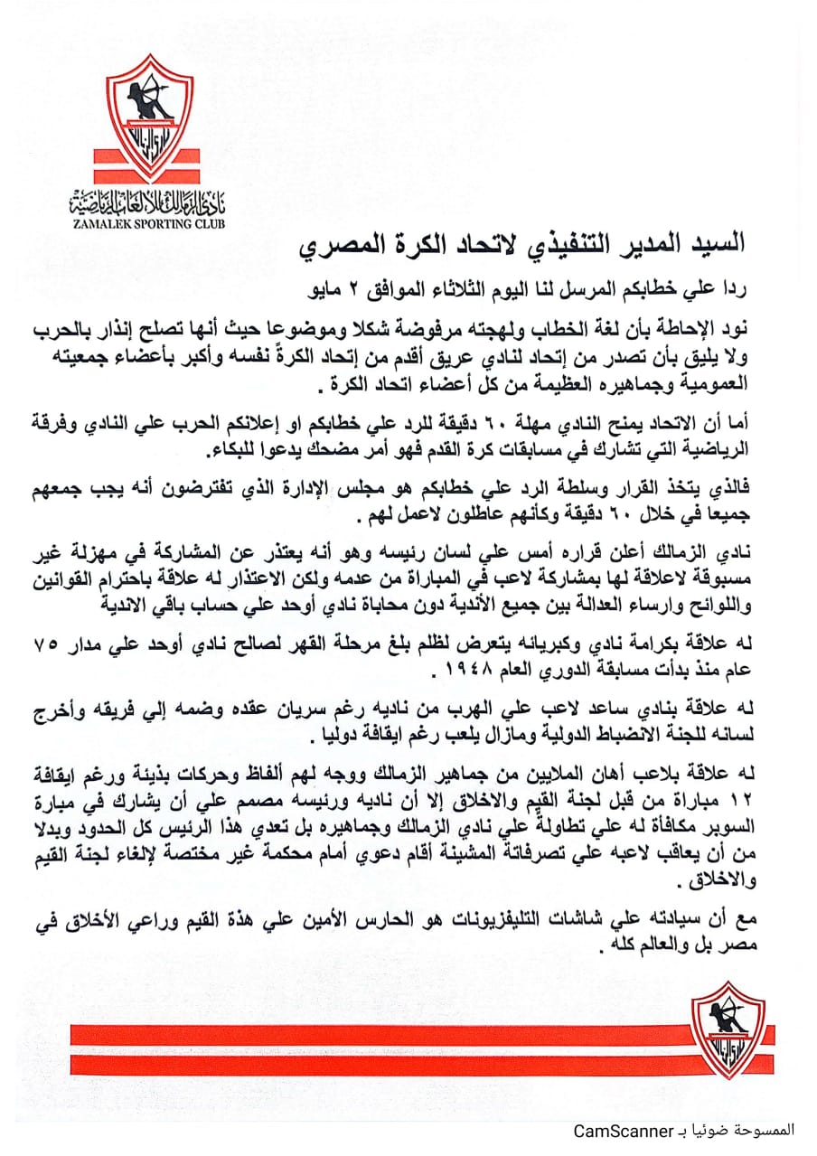 وكان مرتضي منصور الصادر بحقه حكم العزل من رئاسة نادي الزمالك، قد أعلن عن رده علي خطاب اتحاد الكرة المصري، وذلك عبر الرسمية علي الفيسبوك، وكتب “ بعد قليل ننشر رد نادي الزمالك علي خطاب اتحاد الكرة الذي امهل نادي الزمالك 60 دقيقة للرد مع انه امهل اللاعب الهارب 60 يوم لتنفيذ العقوبة التي لم تنفذ حتي اليوم ".