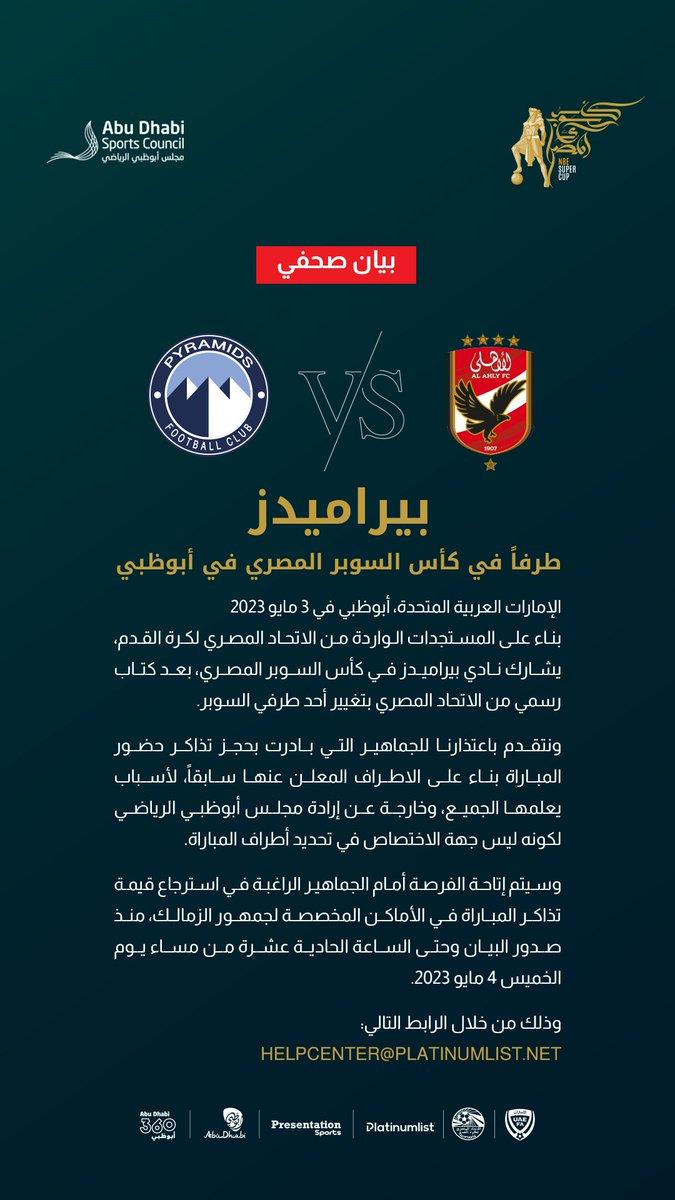 وجاء في بيان مجلس أبو ظبي الرياضي اليوم: "بيراميدز طرفا في كأس السوبر المصري في أبو ظبي"، مضيفاً، "بناء على المستجدات الواردة من الاتحاد المصري لكرة القدم، يشارك نادي بيراميدز في كأس السوبر المصري، بعد كتاب رسمي من الاتحاد المصري بتغيير أحد طرفي السوبر".