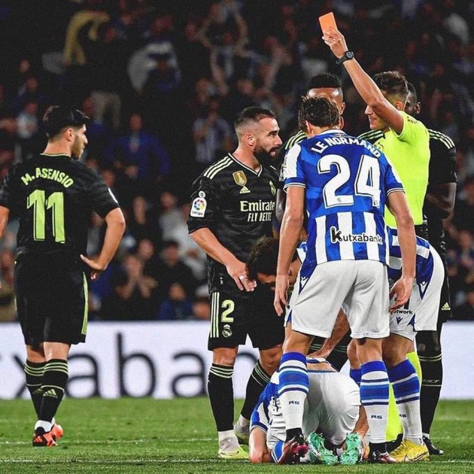 ريال سوسيداد ..وتعرض داني كارفاخال ظهير أيمن ريال مدريد، للطرد في الشوط الثاني من المباراة بعد تدخل عنيف على أيهين مونيوز لاعب ريال سوسيداد، لينال بطاقة صفراء ثانية في غضون 8 دقائق فقط ويُطرد في الدقيقة الـ61 من عمر اللقاء.