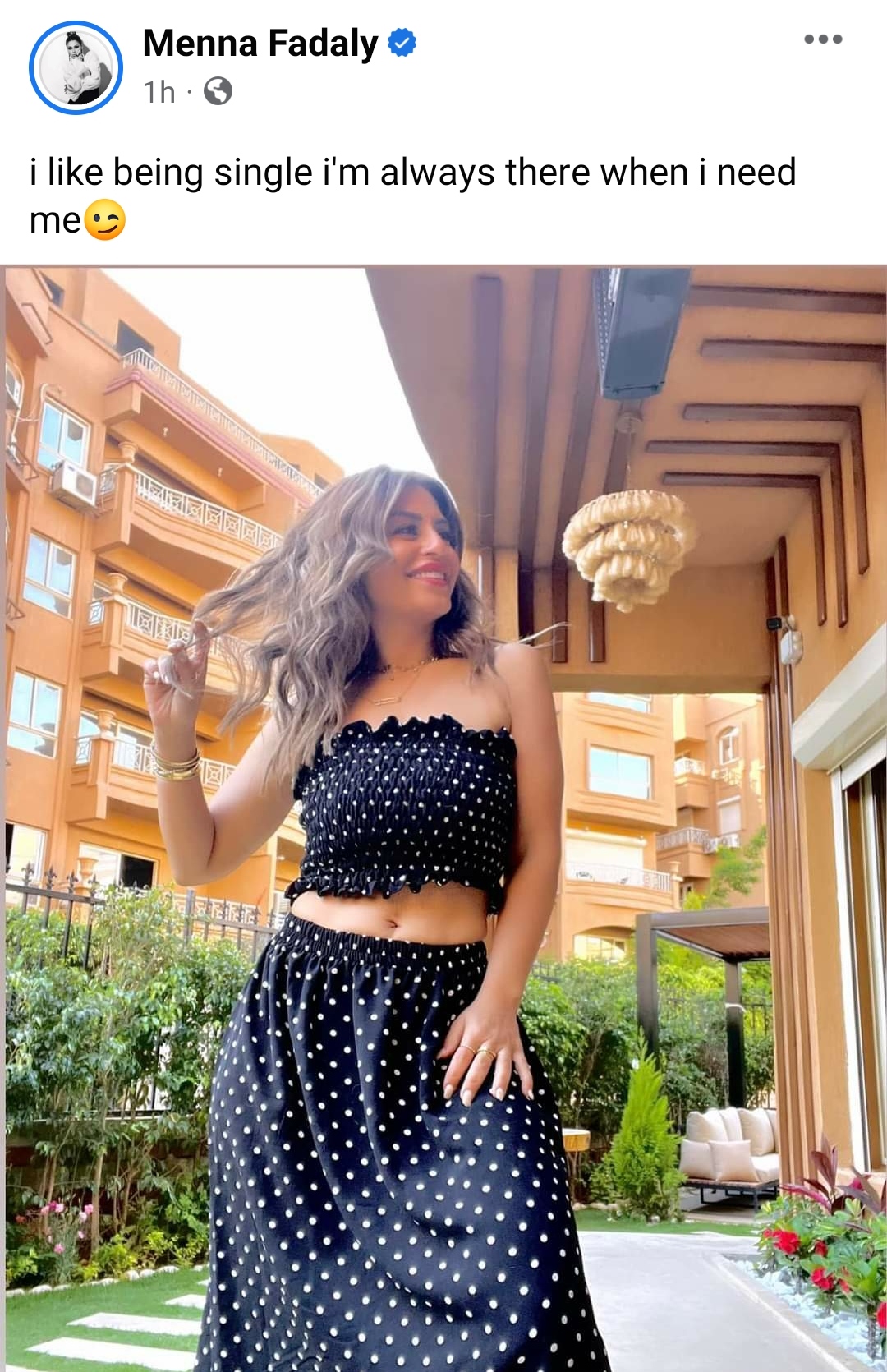 وظهرت منة في صورة وهي ترتدي توب من اللون الاسود بنقط بالابيض، وجيبة من نفس القماشة وعلق على الصورة قائلة:" أحب أن أكون أعزب ، فأنا دائمًا موجود عندما أحتاج إلي".
