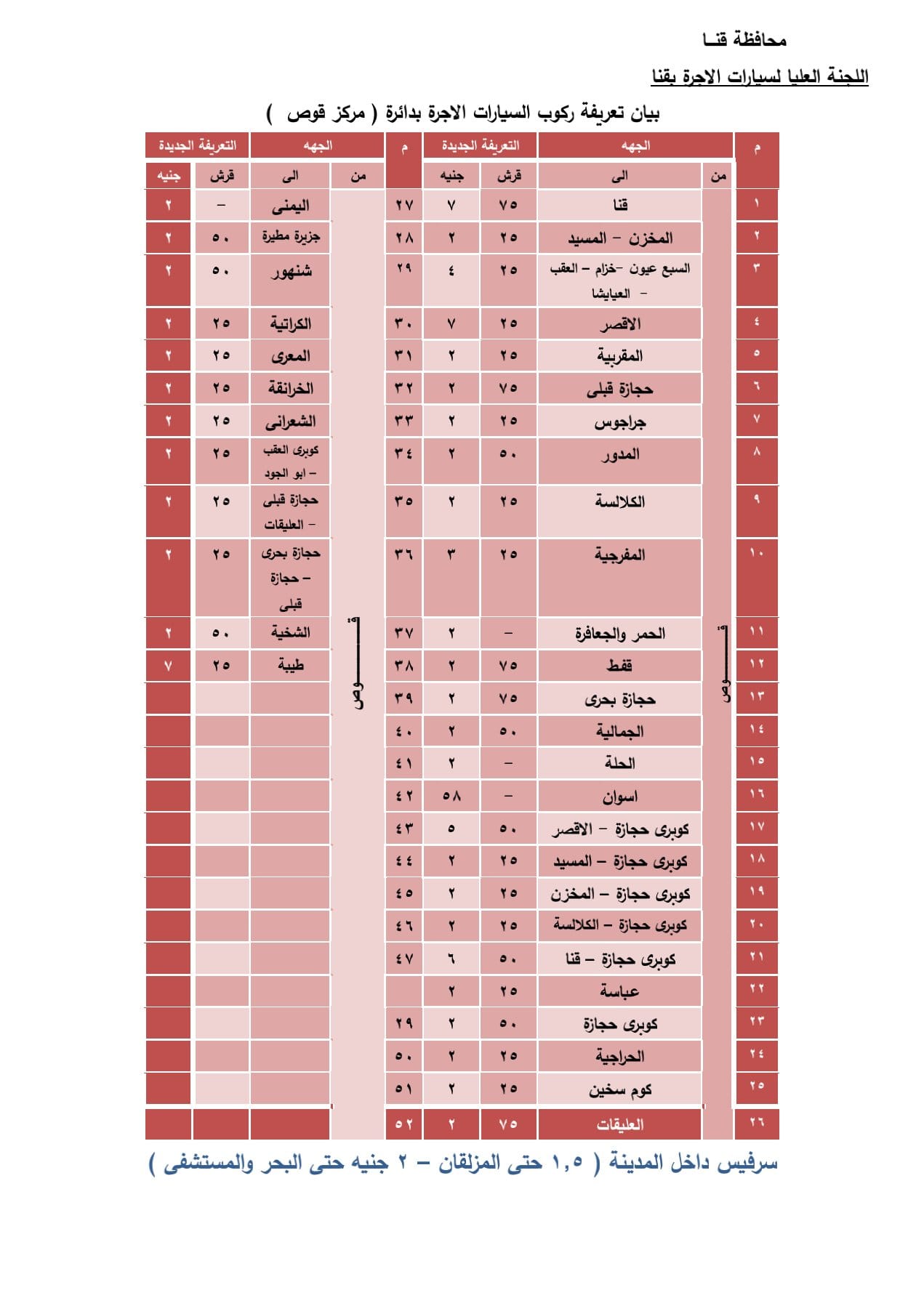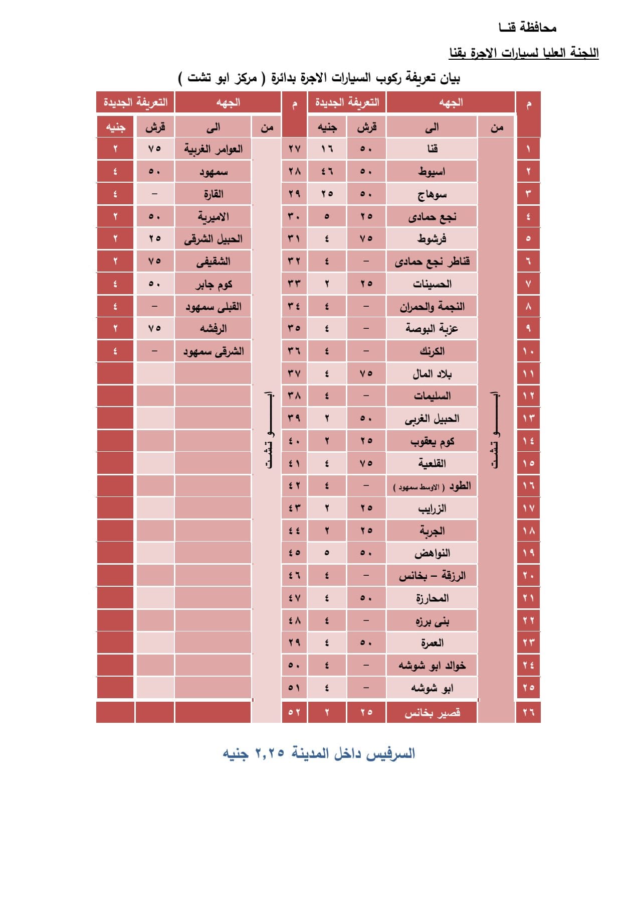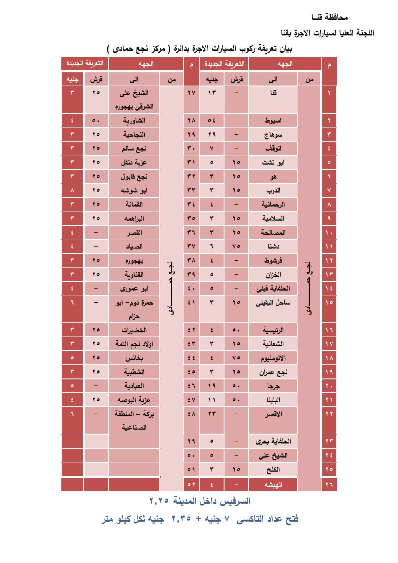 محافظ قنا يعلن تعريفة الركوب الجديدة عقب تحريك سعر السولار