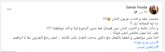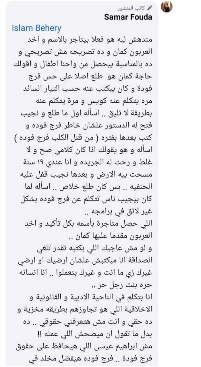 وأضافت سمر فودة : " اللي حصل متاجرة بأسمه بكل تأكيد و اخد العربون مقدما عليها كمان.. و لو مش عاجبك اللي بكتبه تقدر تلغي الصداقة انا مبكتبش علشان ارضيك او ارضي غيرك زي ما انت و غيرك بتعملوا .. انا انسانه حره بنت رجل حر".