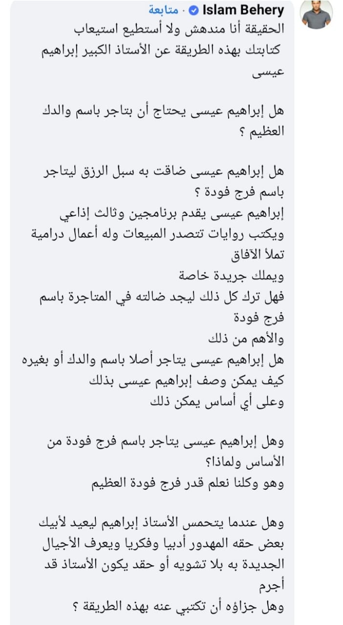 وقال إسلا بحيري: "عندما يتحمس الأستاذ إبراهيم ليعيد لأبيك بعض حقه المهدور أدبيا وفكريا ويعرف الأجيال الجديدة به بلا تشويه أو حقد يكون الأستاذ قد أجرم، وهل جزاؤه أن تكتبي عنه بهذه الطريقة "، مضيفًا :" والدك كان عظيما وإبراهيم عيسى عظيم بل وهرم ثقافي في حياتنا المعاصرة".