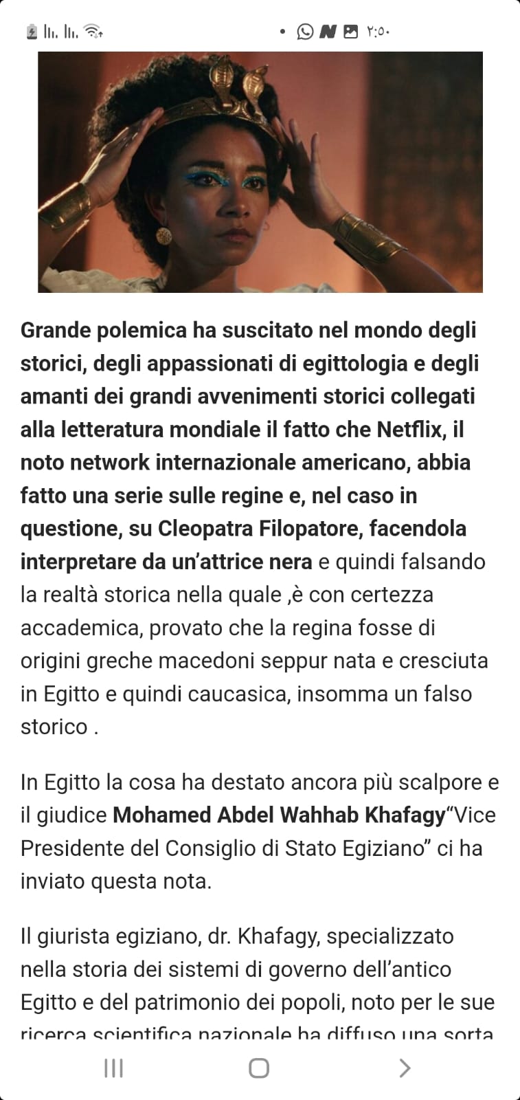وركزت الصحيفة أن القاضى المصرى ألقى الضوء على أزمة فيلم كليوباترا التى تعتزم شبكة نتفليكس “Netflix”بثه بعد أيام وأنها إغريقية مقدونية الأصل مصرية النشأة والإنتماء للتقاليد المصرية واَمنت بحماية الإلهة إيزيس ولم تكن إفريقية وأن الفيلم ليس حرية فن بل ديكتاتورية فن مزيفة للتاريخ المصرى القديم مهدرة للحضارة المصرية ومنكرة للتراث الإنسانى .