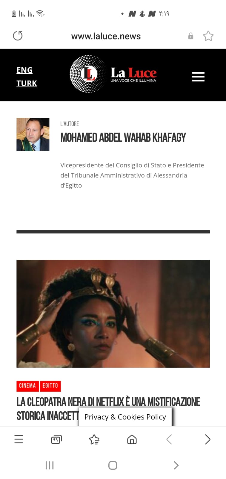 أشادت الصحافة الإيطالية بدراسة القاضى المصرى المستشار الدكتور عبدالوهاب خفاجى نائب رئيس مجلس الدولة المصرى عن " رسالة إلى العالم مصر القديمة شعباً وحكاماً ليسوا أفارقة وكليوباترا المفترى عليها فى الفن والسياسة" وقد احتلت الدراسة قراءة كبيرة فوق أخبار دولية أخرى باعتباره الحدث الأبرز حضارياً على مستوى العالم .