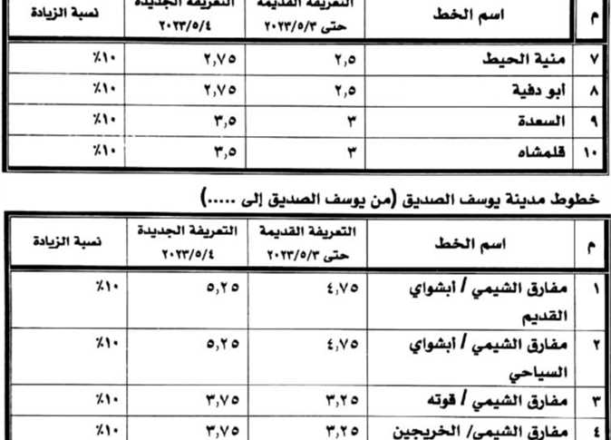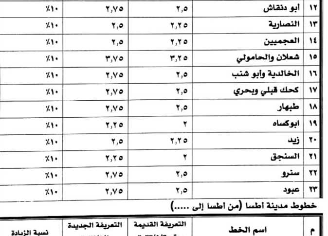 ووجه المحافظ، مدير عام المواقف، بالإعلان عن التعريفة الجديدة في مكان واضح بجميع مواقف السيارات بدائرة المحافظة، من خلال وضع لافتة مبينًا بها خطوط السير، وقيمة الأجرة المقررة لكل خط، وكذا وضع استيكرات موضح به تعريفة الركوب وخط السير وعدد الركاب يتم لصقها على الزجاج الأمامي والخلفي لسيارات الأجرة والسرفيس، لتوعية المواطنين بتعريفة الركوب الرسمية، مع تطبيق القانون بكل حزم على المخالفين.