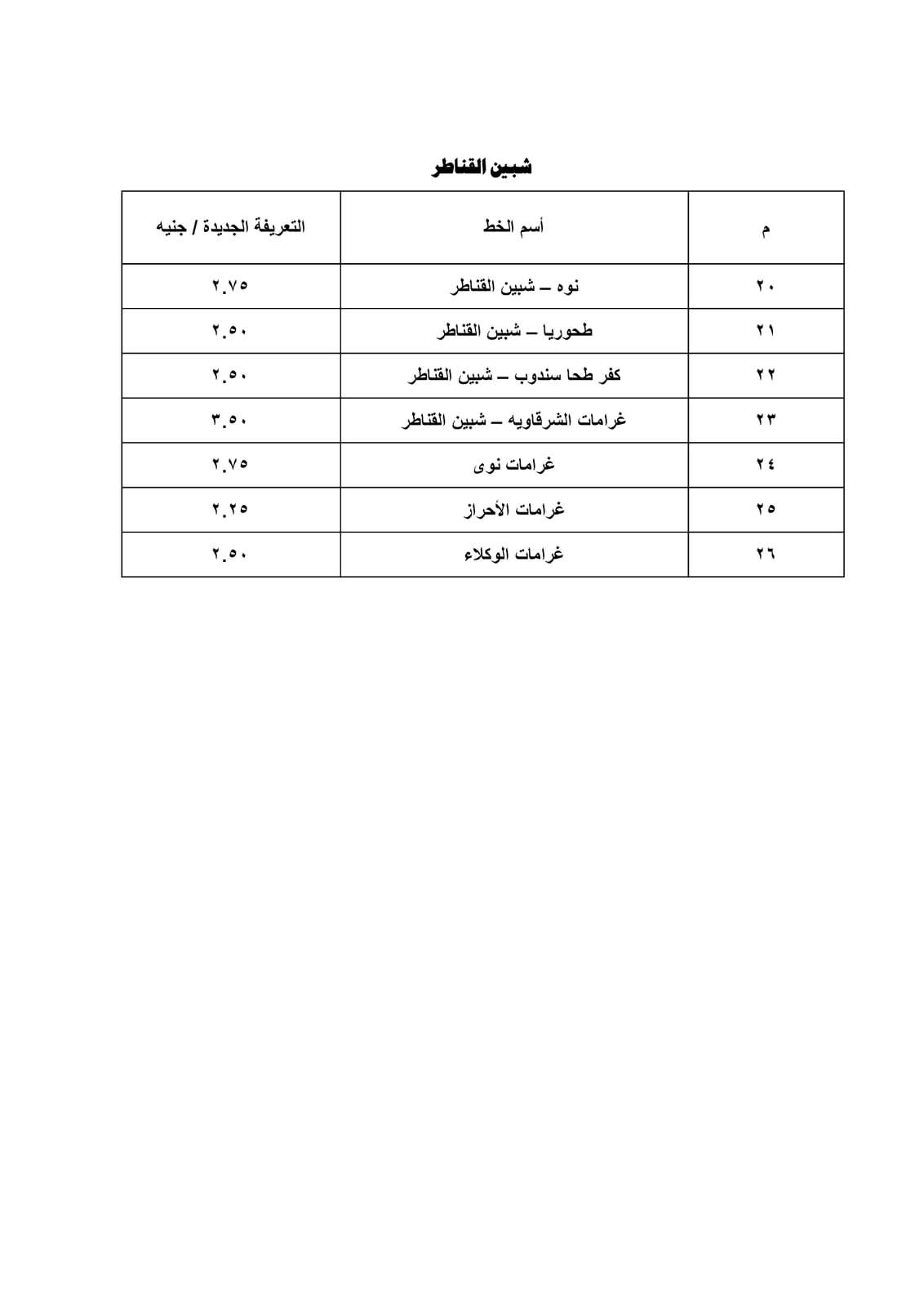 وأفاد محافظ القليوبية، أن القرار الصادر نص على إلزام السائقين وأصحاب المركبات والسيارات بالتعريفة الجديدة، مع تكليف مديري إدارة المرور ومدير مباحث المرور ومدير المواقف بتكثيف الحملات على سيارات ومركبات نقل الركاب بمختلف مواقف المحافظة وبالميادين المختلفة لمتابعة التزام السائقين بالتعريفة الجديدة وعدم مخالفة خطوط السير وعدم استغلال المواطنين، على أن يتم وضع ستيكر بقيمة التعريفة الجديدة على زجاج السيارة الأمامي والخلفي، بالإضافة إلى عمل بانرات ولوحات إرشادية بالتعريفة الجديدة وأرقام الشكاوى ويتم وضعها بجميع مواقف نقل الركاب بالمحافظة.