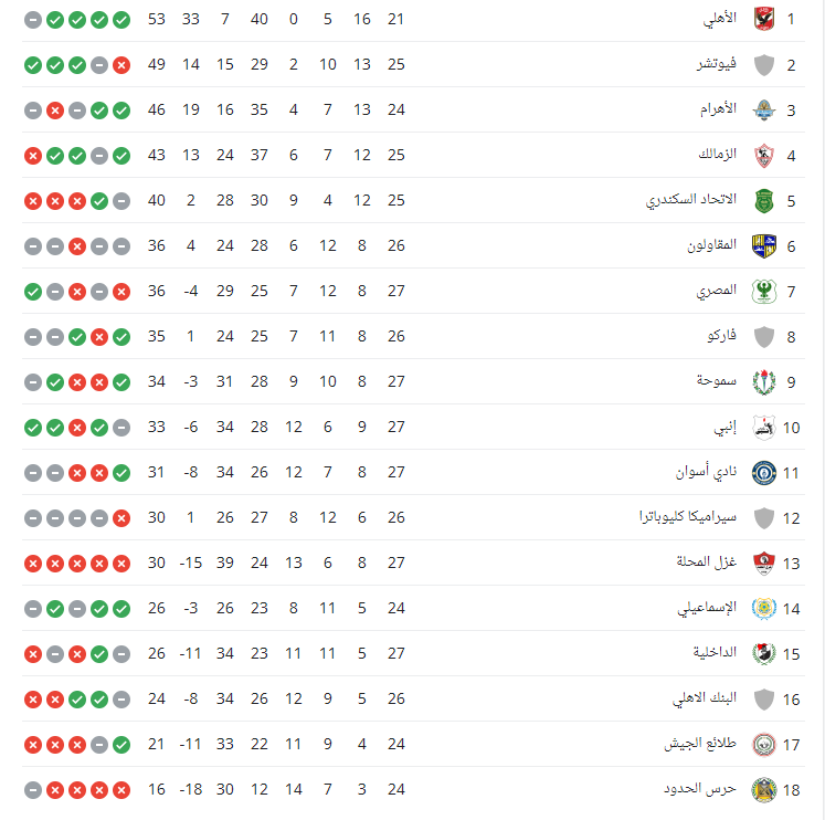 واستطاع المارد الأحمر ان ينفرد بصدارة جدول ترتيب الدوري المصري برصيد 53 نقطة، وبفارق 4 نقاط عن فريق فيوتشر في المركز الثاني برصيد 49 نقطة، وجاء جدول ترتيب الدوري المصري على النحو التالي: