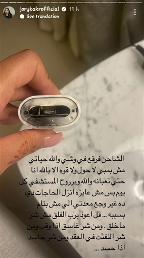 وعلقت جوري قائلة: "الشاحن فرقع في وشي والله حياتي مش بمبي .. لا حول ولا قوة إلا بالله أنا حتى تعبانة والله وبروح المستشفى كل يوم بس مش عايزة أنزل الحاجات دي .. ده غير وجع معدتي اللي مش بنام بسببه قل أعوذ برب الفلق من شر ما خلق ومن شر غاسق إذا وقب ومن شر النفاثات في العقد ومن شر حاسد إذا حسد".