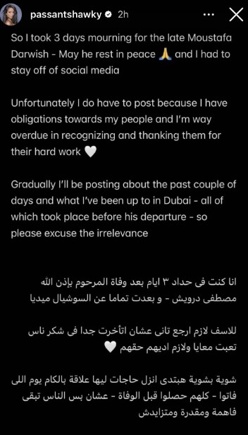 وكتبت بسنت شوقي، من خلال حسابها الرسمي على “إنستجرام”: “كنت في حداد 3 أيام بعد وفاة المرحوم بإذن الله مصطفى درويش، وبعدت تماماً عن السوشيال ميديا للأسف لازم ارجع تاني عشان اتاخرت في شكر ناس تعبت معايا ولازم اديهم حقهم، شوية بشوية هبتدي انزل حاجات ليها علاقة بالكام يوم اللي فاتوا - كلهم حصلوا قبل الوفاة - عشان بس الناس تبقى فاهمة ومقدرة ومتزايدش”.