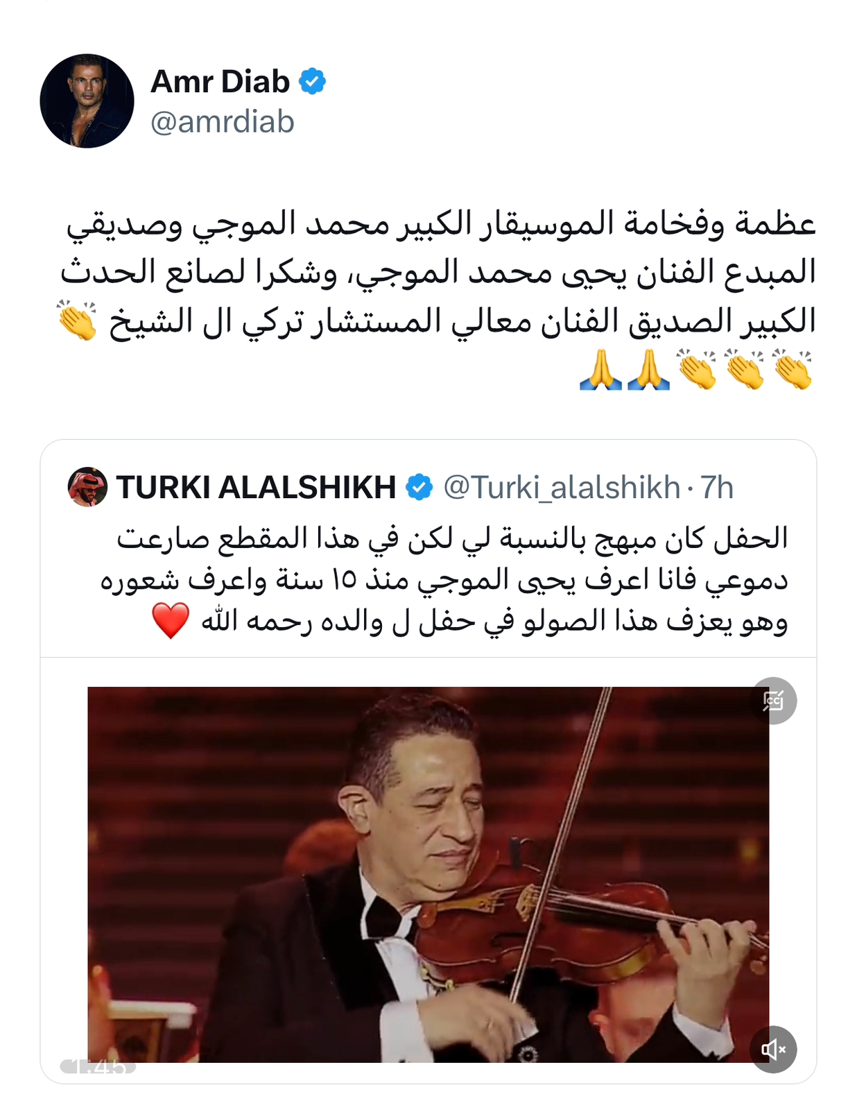 عمرو دياب يهنيء يحيى الموجي بتكريم والده الموسيقار محمد الموجي ويشكر تركي ال الشيخ