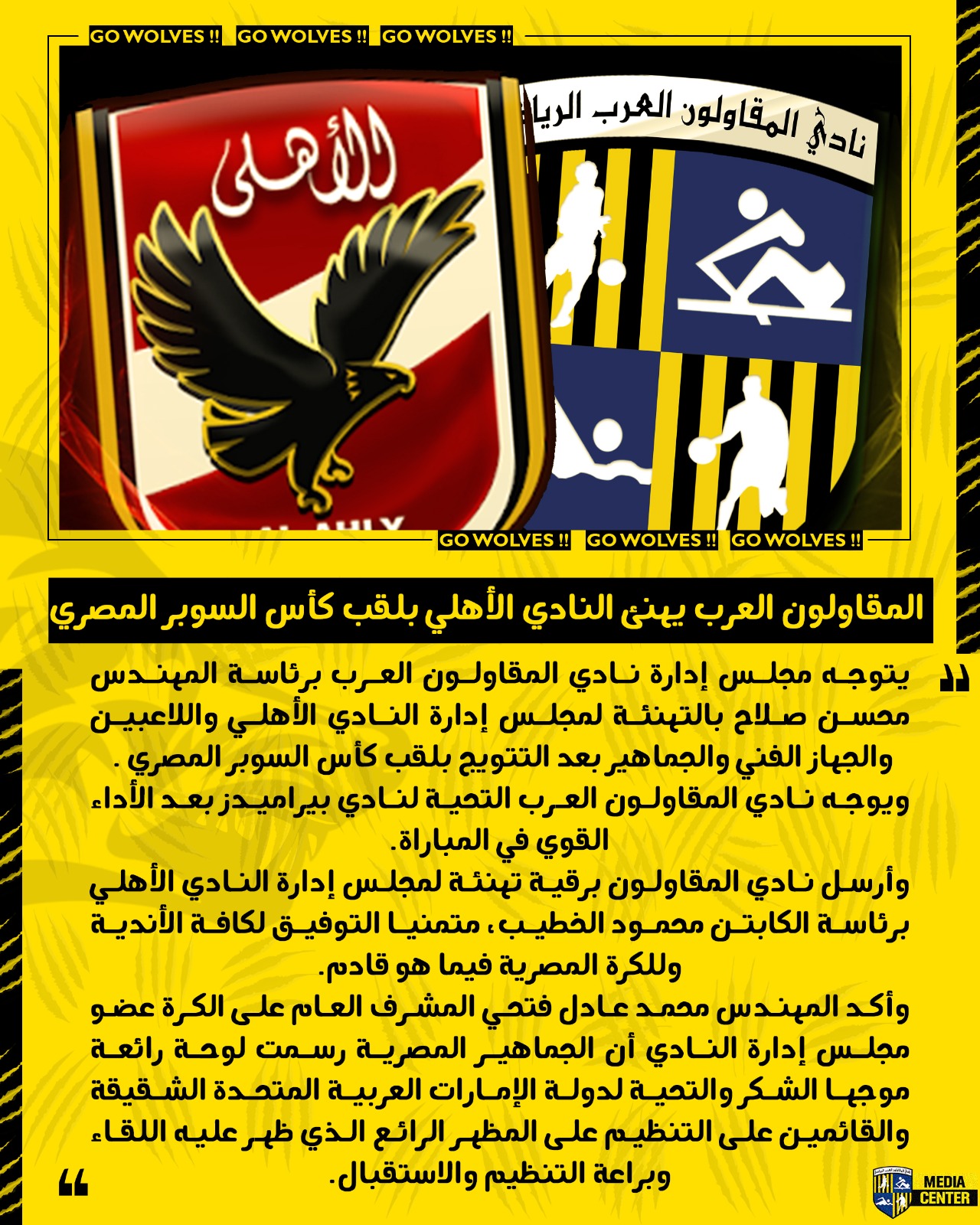 المقاولون العرب يهنئ النادي الأهلي بلقب كأس السوبر المصري