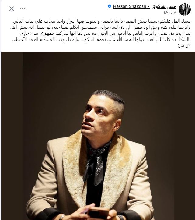 حسن شاكوش.. وقال حسن شاكوش عن أزمته مع زوجته،" مساء الفل عليكم جميعا يمكن القصه دايما ناقصة والبيوت فيها اسرار واحنا بنخاف علي بنات الناس واتربينا علي كده وحق الرد بيقول ان دي لسة مراتي ميصحش اتكلم عنها حتي لو حصل ايه يمكن اهل بيتي وفريق عملي واقرب الناس ليا أتاذوا من الحوار ده بس بما انها شاركت جمهوري بشئ جارح بالشكل ده كل اللي اقدر اقولوا الحمد الله علي نعمة السكوت والعقل وقت المشكلة الحمد الله علي كل شئ".