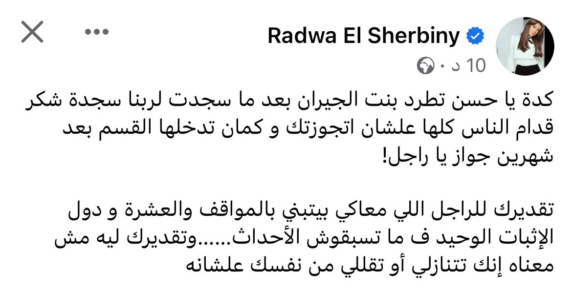 وكتبت رضوى الشربيني، قائلة :"كدة يا حسن تطرد بنت الجيران بعد ما سجدت لربنا سجدة شكر قدام الناس كلها علشان اتجوزتك و كمان تدخلها القسم بعد شهرين جواز يا راجل!".