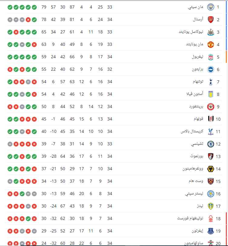 ويتواجد فريق مانشستر سيتي في المركز الأول من جدول ترتيب الدوري الإنجليزي برصيد 79 نقطة، فيما يتواجد أرسنال في المركز الثاني برصيد 78 بفارق نقطة واحده، وجاء جدول ترتيب الدوري الإنجليزي على النحو التالي: