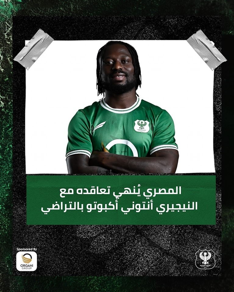 أعلن نادي المصري البورسعيدي صباح اليوم السبت، ع إنهاء التعاقد مع النيجيري أنتوني أكبوتو لاعب الفريق بالتراضي بين الطرفين.