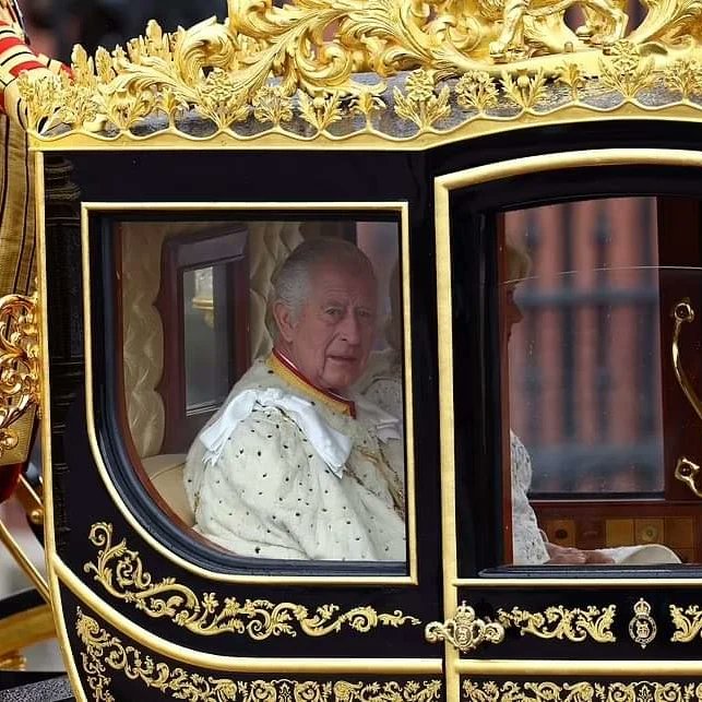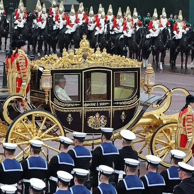 الملك تشارلز.. وعزفت فرقة عسكرية النشيد الوطني مع انطلاق موكب الملك والملكة القرينة من قصر باكنجهام، وانفجرت الحشود بالهتافات التي دوت في المكان.