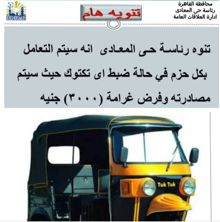 وأكدت الصفحة الرسمية لحي المعادي بموقع التواصل الاجتماعي "فيس بوك"، أنه سيتم ضبط ومصادرة أي توك توك وفرض غرامة 3000 جنيه.