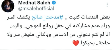 كتب مدحت صالح عبر صفحته على موقع التواصل الإجتماعي “الفيسبوك” قائلة:" بعض المنصات كتبت مدحت صالح يكشف السر وراء عدم مشاركته في حفل روائع الموجي.. والرد أن لم تتم دعوتي من الأساس وبالتالي مفيش سره ولا حاجة، بحبكوا".